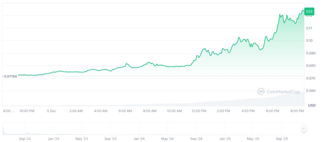 According to CoinMarketCap, Terra’s (LUNA) current price stands at $0.12, with a sharp 72.62% increase over the last 24 hours. The market cap totals $88.15 million, while the 24-hour trading volume surged by 1475.37% to $210.57 million. Despite recent gains, LUNA’s value has declined over longer periods.