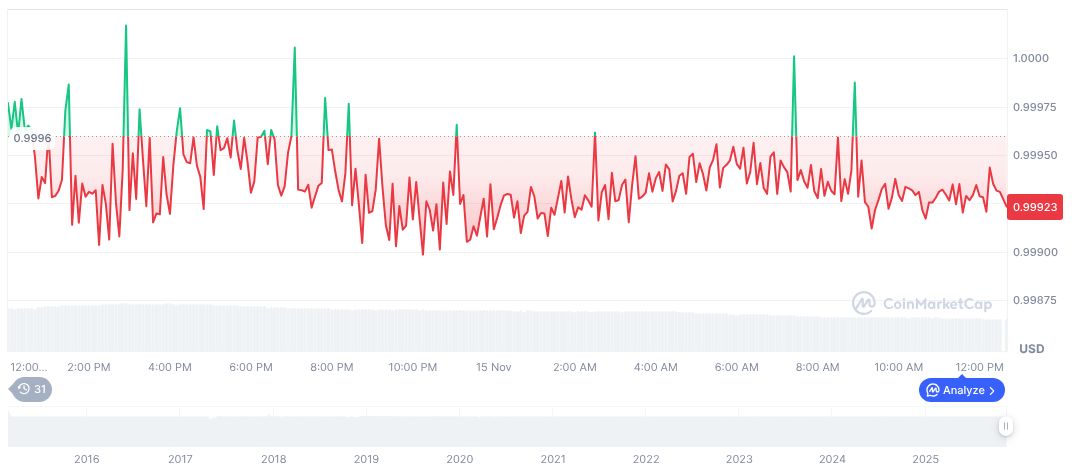 According to CoinMarketCap data, Tether’s USDT maintains its value at $1.00, with a market capitalization of $183.92 billion and a trading volume of approximately $90.32 billion, marking a 50.02% decrease. Over the past three months, USDT has experienced a minor price fluctuation, maintaining stability around $1.00.