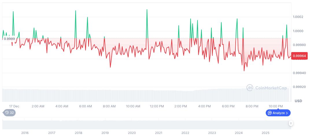 According to CoinMarketCap, Tether USDt maintains a stable price at $1.00. The market cap registers at $186.25 billion with a trading volume of $91.91 billion, reflecting a 6.41% market dominance. Recent price changes indicate a slight decrease of 0.03% over 24 hours with a marginal 90-day drop of 0.05%.