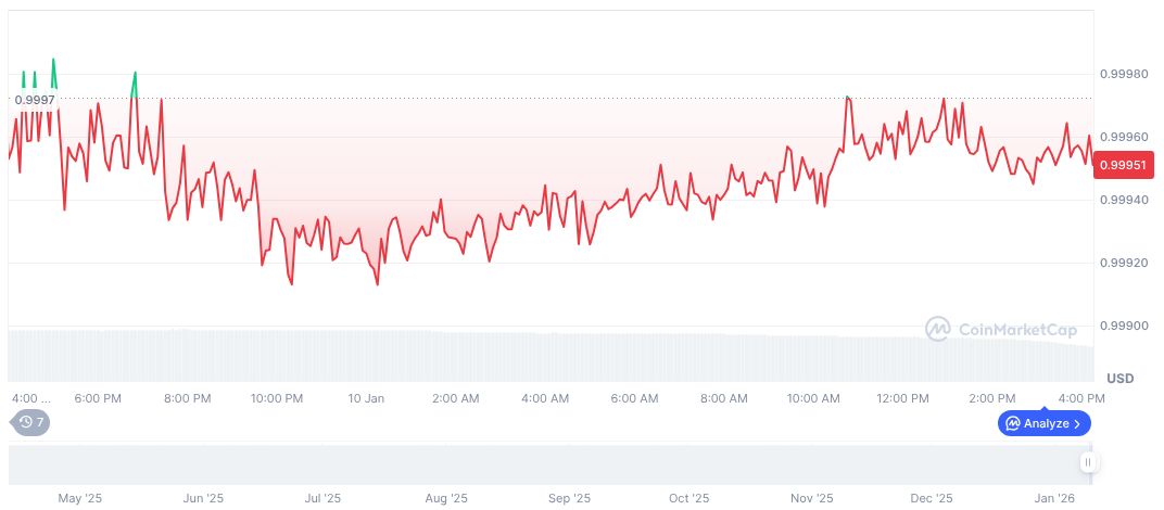 World Liberty Financial USD (USD1) is valued at $1.00, with a market cap of $3.40 billion. Its 24-hour trading activity has decreased to $600.93 million, marking a 29.94% drop. CoinMarketCap data shows price changes across 24 hours (-0.01%) and highlights a stable trajectory over 90 days.