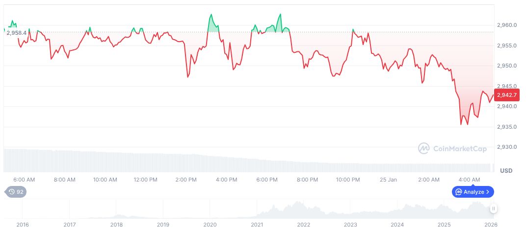 Based on data from CoinMarketCap, Ethereum (ETH) is currently priced at $2,880.25, with a market cap of $347.63 billion and a 24-hour trading volume of $12.42 billion, reflecting a 12.27% change. The cryptocurrency has experienced a 2.70% decline over the last 24 hours, and a substantial 31.89% decrease over the 90-day period.