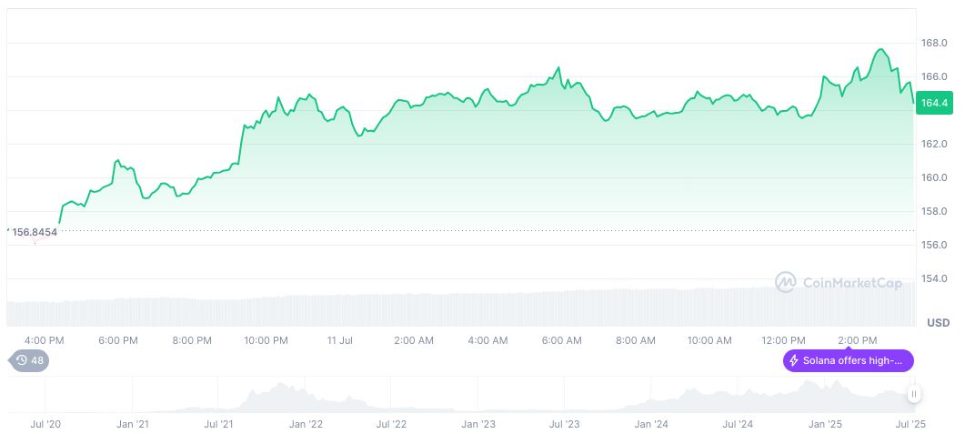 According to CoinMarketCap, Solana (SOL) trades at $162.66 with a market cap of $87.19 billion, reflecting a 9.98% weekly gain despite a 1.25% daily decline. This highlights continued investor interest and trading volume despite recent volatility.