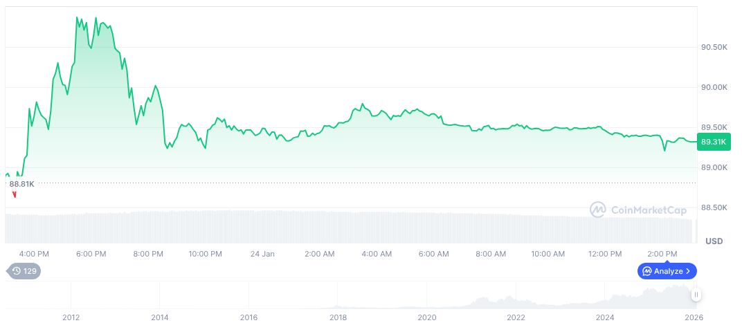 Bitcoin’s current price stands at $88,228.05, with a market cap of $formatNumber(1762827274377.64, 2). Recent trading volume fell 49.63% within 24 hours. Despite a 1.40% decrease in the last day, its 90-day price change reflects a more significant 23.47% drop, as per CoinMarketCap data.
