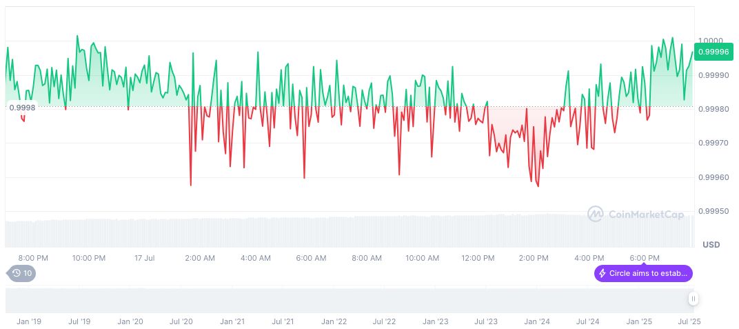 According to CoinMarketCap, USDC maintains a $1 price with a market cap of formatNumber(64725958783, 2) billion and a 1.65% market dominance. The stablecoin’s trading volume reached formatNumber(23720545811, 2) billion, reflecting robust activity amid its regulatory milestone. Recent price metrics reveal minimal fluctuations, highlighting its stability.