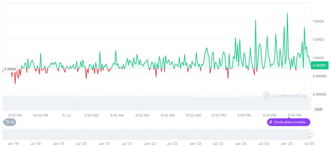According to CoinMarketCap, USDC remains stable at $1.00, with a market cap of $63.24 billion and a 1.66% market dominance. The 24-hour trading volume declined by 8.98%, with minimal price changes over recent months. Data as of 17:40 UTC, July 16, 2025.