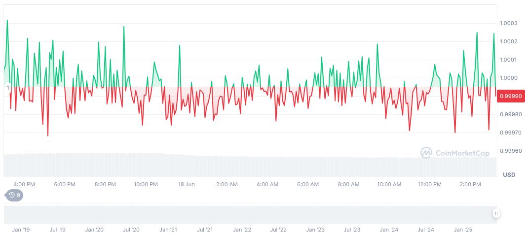 According to CoinMarketCap, USDC holds a market cap of $61.50 billion with a price of $1.00. Its market dominance is at 1.91% with a 24-hour trading volume of $9.89 billion, despite a trading downturn of 22.91%. Supply remains confidently in circulation at 61.51 billion USDC.