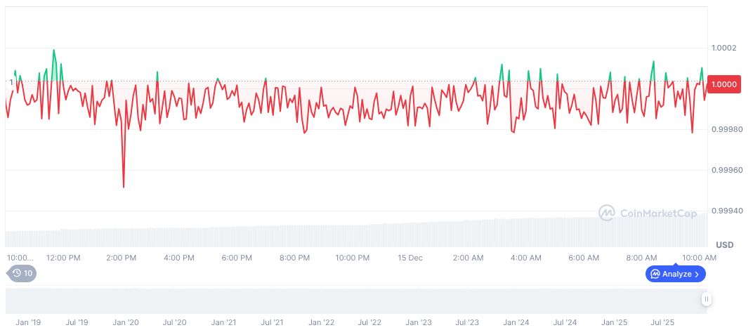 USDC holds a steady price of $1.00 with a market cap at formatNumber(78485794608, 2), representing 2.67% dominance. Although its 24-hour trading volume spiked by 124.27%, prices saw a 30-day dip of 1.02%. Data from CoinMarketCap on December 15, 2025, confirms these statistics.