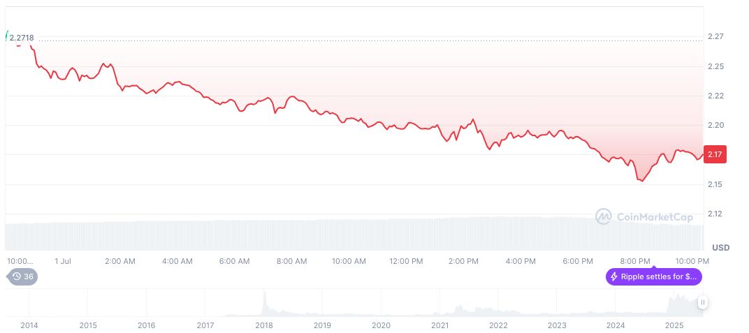 Currently, XRP is priced at $2.18, reflecting a 24-hour decline of 4.25%. With a market cap of nearly $128.35 billion, XRP holds a 3.95% dominance. Trading volumes show a 4.80% decrease over the past day, according to CoinMarketCap data.