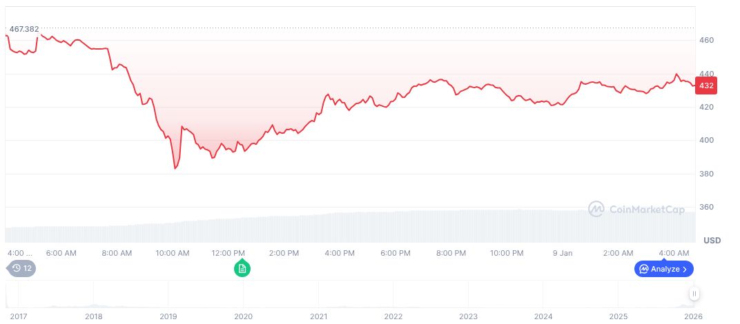 As of January 9, 2026, Zcash (ZEC) traded at $432.95, with a market cap of $7.13 billion and market dominance of 0.23%. According to CoinMarketCap, the 24-hour trading volume surged to $1.44 billion, marking a 92.79% increase. Price movements show a 4.15% decline over 24 hours and a significant 33.58% drop over 60 days, though ZEC saw a notable 103.46% increase over 90 days.