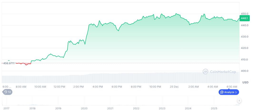Zcash (ZEC) is currently priced at $445.33, with a market cap of $7.33 billion and a dominance of 0.25%. Over the past 90 days, ZEC’s price surged by 714.71%. The 24-hour trading volume stands at $708.09 million, showing a 51.11% change as per CoinMarketCap.