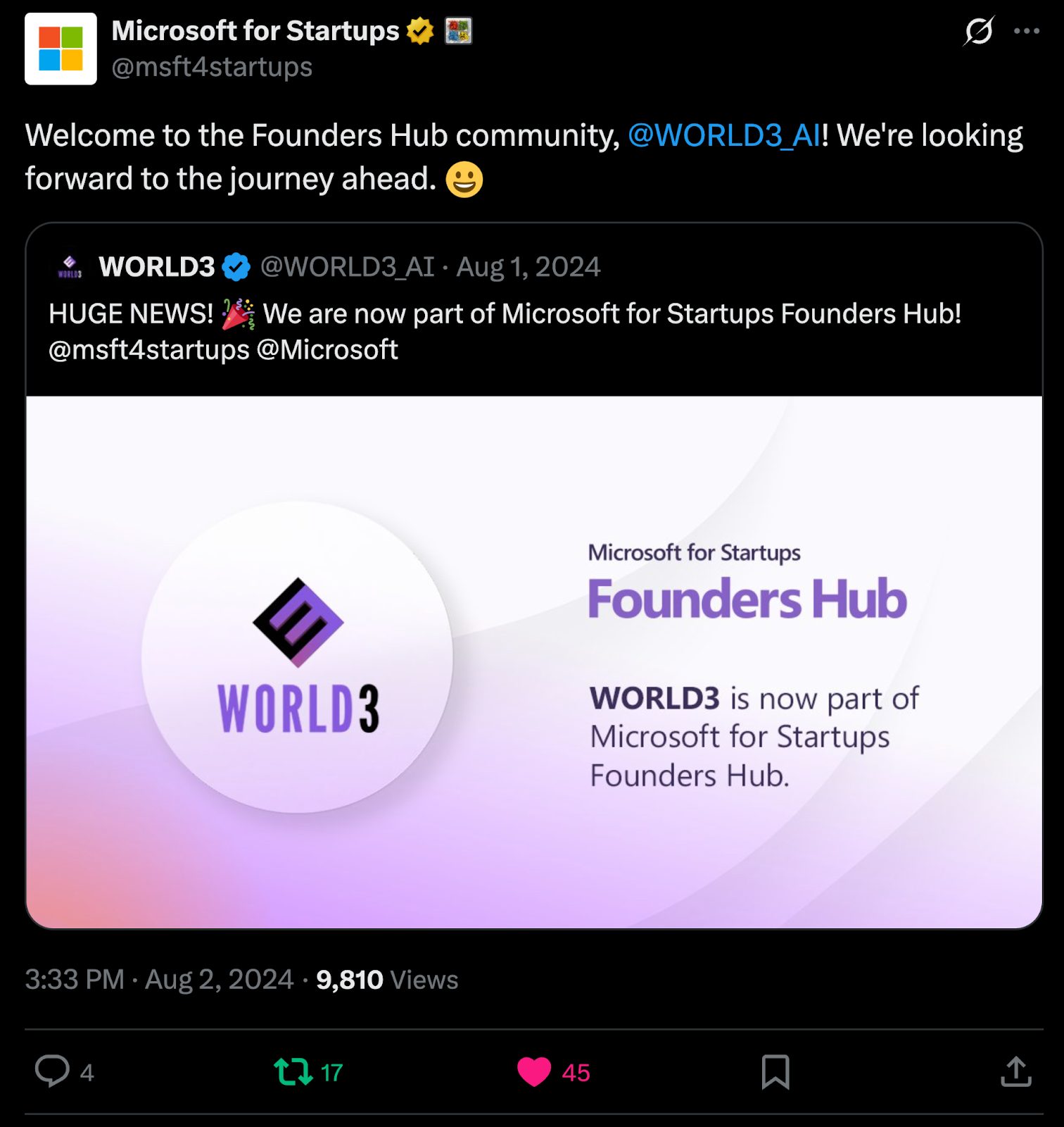 The platform’s robust infrastructure is built in collaboration with the world’s leading technology firms. As a member of the Microsoft for Startups Founders Hub, WORLD3 leverages Azureโs advanced AI infrastructure to support a diverse range of large language models (LLMs), including OpenAIโs GPT, Anthropicโs Claude, and Llama, each optimized for different agent tasks. This partnership was recently highlighted by an official welcome from Microsoft for Startups on X.