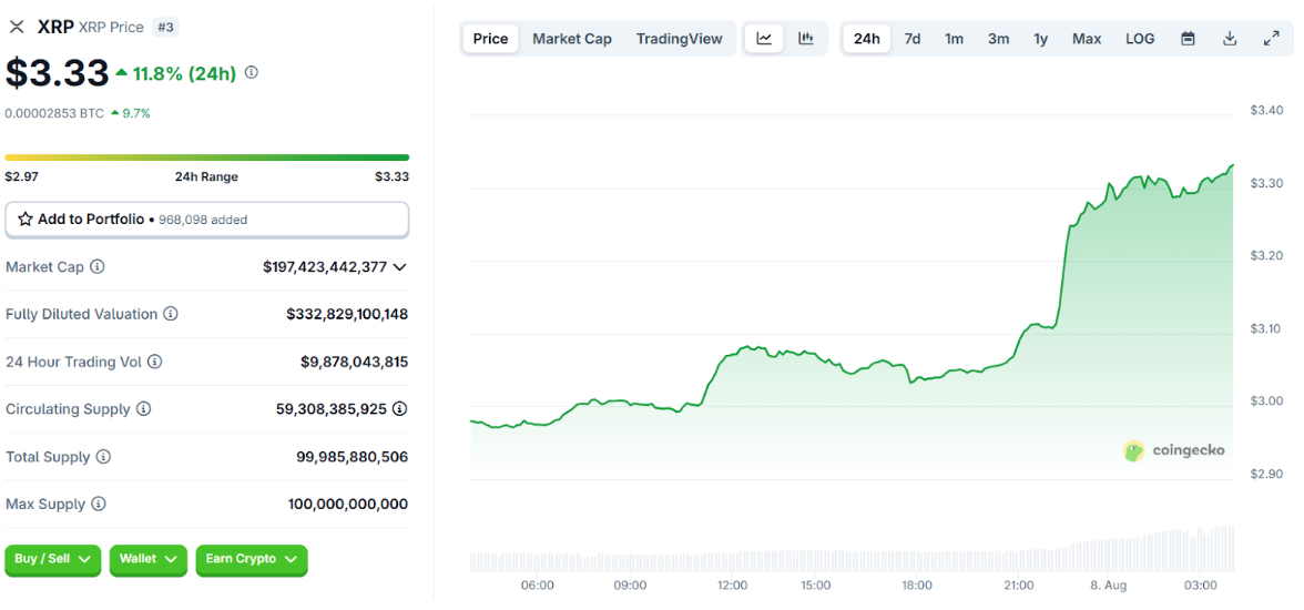 With Ripple and the SEC jointly dropping appeals, a significant overhang has finally lifted off the XRP price chart. The case ruling, now final, says XRP’s retail sales aren’t securities. This clarity alone has reawakened institutional interest. Japan’s SBI Holdings has filed for a Bitcoin-XRP ETF, which could open XRP to a new wave of regulated investors. Corporate allocations could reach $1 billion if approved. That adds a serious tailwind. XRP has increased from $3.04 to $3.33 and could gain more traction. Using sentiment and macro-trend analysis, ChatGPT points to $7–$9 as realistic targets if ETF momentum continues and stablecoin adoption grows.