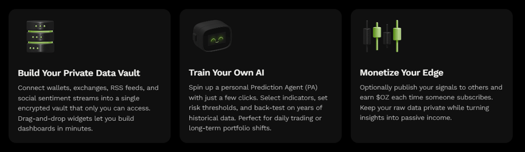 Ozak AI is a blockchain-based crypto project that provides a technology platform that specializes in predictive AI and advanced data analytics for financial markets. Through machine learning algorithms and decentralized network technologies, Ozak AI enables real-time, accurate, and actionable insights to help crypto enthusiasts and businesses make the correct decisions.