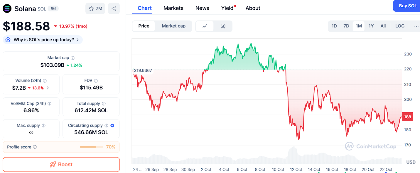 Solana continues to gain strength as one of the leading altcoins in the market, with traders and analysts expecting a strong rally in the months ahead. SOL is currently trading around $188, supported by $160, $145, and $120, with resistance levels at $210, $310, and $500—a structure that signals healthy upside potential if bullish momentum continues. As institutional interest grows and network activity expands, Solana is positioning itself as one of the primary potential assets likely to thrive in the next bull run.