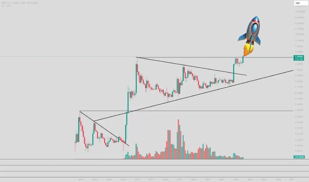 Crypto analyst Amonyx has stated that this breakout was in the making for years, sharing a chart that shows XRP finally breaking a bearish descending resistance from 2018. A move above the line and an increasing support level indicate that larger-scale traders are accumulating. The real spark comes from XRP pushing beyond the $3 resistance zone. Analysts believe this breakthrough could drive XRP toward that long-awaited $20 mark.