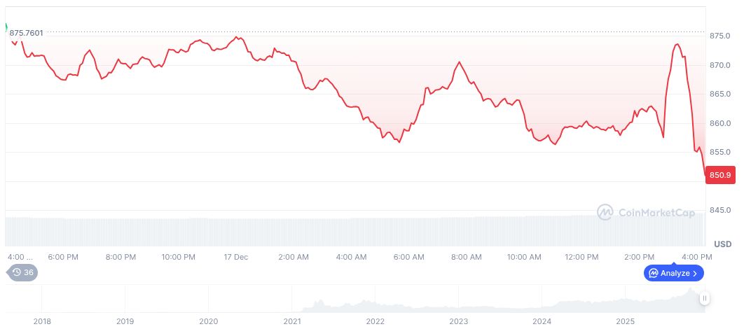 BNB’s market performance remains cautious amidst the disclosure, with prices at $842.05 and a market cap of formatNumber(115979858825.67, 2). The last 24 hours saw a price decrease of 3.20%, aligning with a waning market dominance at 3.99%. Data from CoinMarketCap as of December 17, 2025, showcases ongoing market volatility.