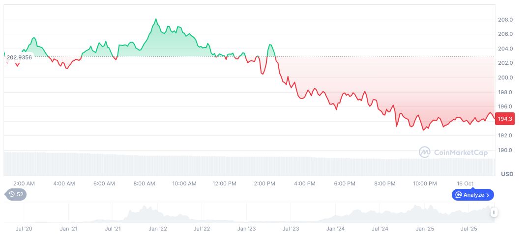 According to CoinMarketCap, Solana (SOL) has a current price of $194.56. Its market cap stands at $106,365,933,626 with a market dominance of 2.83%. Over the past 24 hours, the trading volume reached $9,658,092,012, marking a decrease of 27.37%. Price changes show declines over various periods, with a 24-hour drop of 4.13% and a 7-day reduction of 14.41%. However, it recorded a 90-day growth of 8.13%.