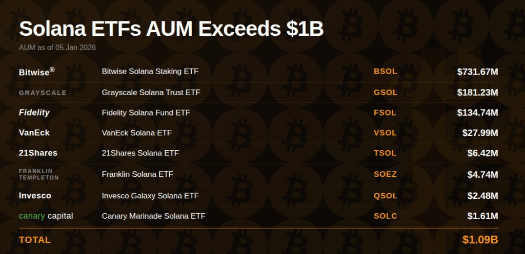 Solana-based ETFs have officially surpassed $1.09 billion in assets under management as of January 5, 2026. Bitwise dominates with $731.67 million in AUM, securing nearly 67% of the total market share. Grayscale’s GSOL and Fidelity’s FSOL follow with $181.23 million and $134.74 million, respectively.