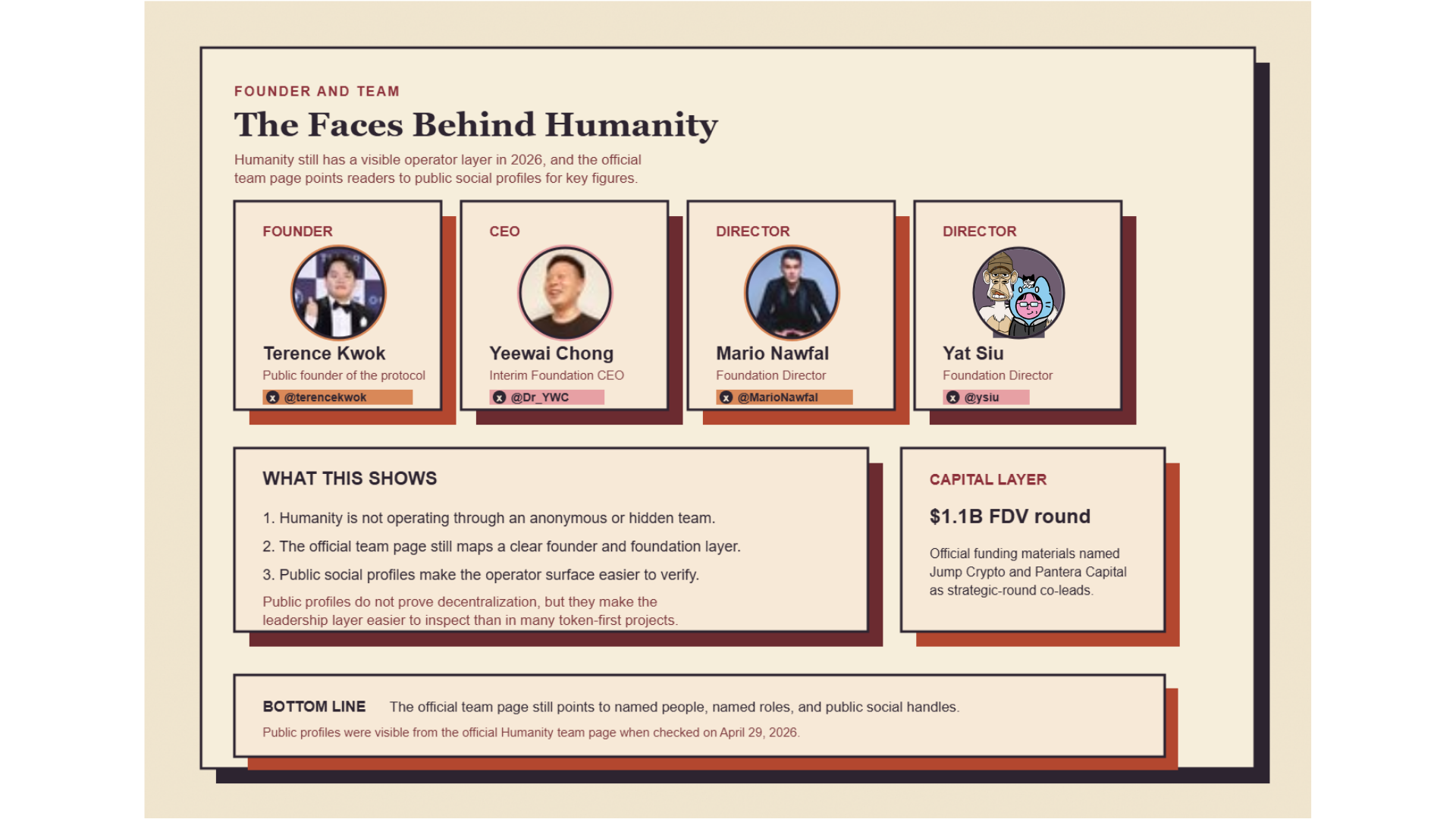 According to the official team page, Terence Kwok is listed as Founder. Yeewai Chong is listed as Interim Foundation CEO. Mario Nawfal and Yat Siu are listed as Foundation Directors. That matters because Humanity is still operating through a recognisable founder-and-foundation structure, even while official mission materials say the long-term goal is a community-governed protocol.