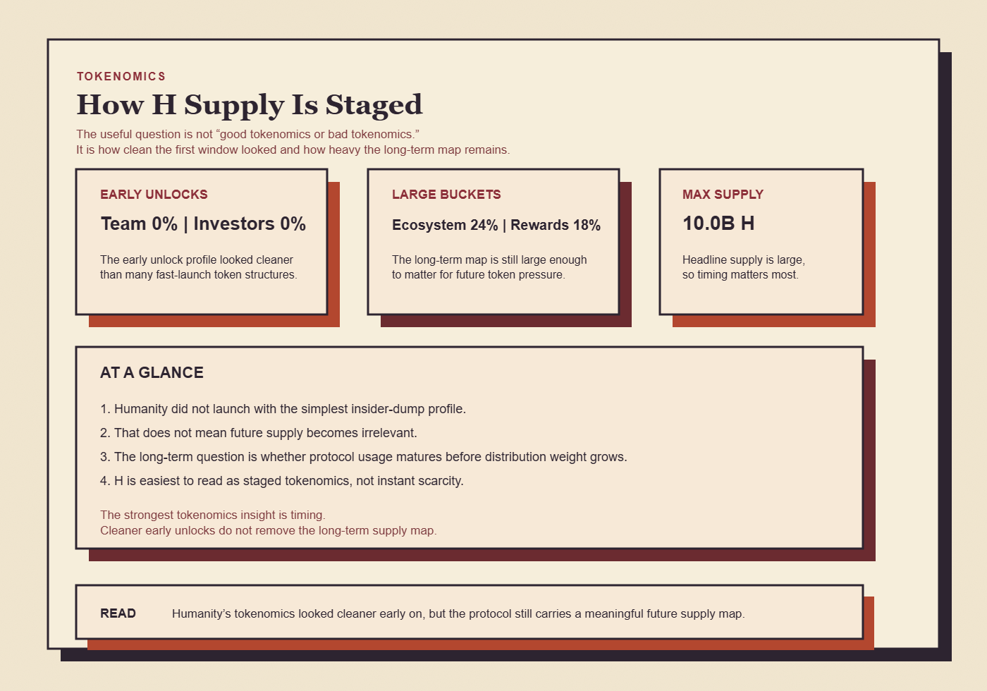 The third risk is supply overhang. The initial unlock structure looked cleaner than many fast-launch tokens, but the future distribution map is still large enough to matter over time. In Humanity’s case, that pressure would come less from a simple day-one dump story and more from how larger future buckets eventually move toward the market.