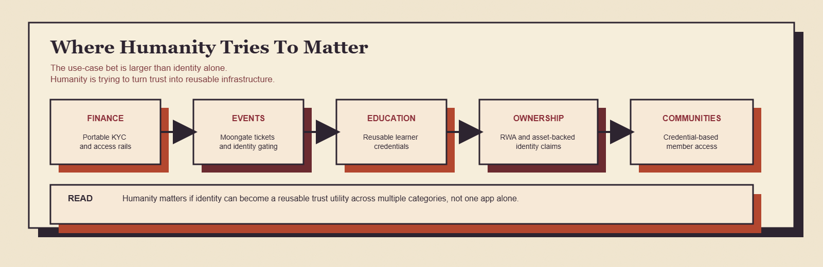 The third difference is the real-world use-case push. Humanity’s official use-case pages point toward finance, RWA-linked ownership, education credentials, loyalty systems, online communities, and access control. That makes the protocol easier to compare with infrastructure than with a one-purpose application. The finance angle becomes easier to read next to Coincu’s coverage of Mastercard’s broader crypto payment support expansion, because Humanity is clearly trying to place identity and trust rails inside that wider financial-access direction.